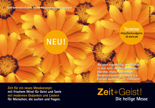 Möchten Sie per eMail über die neuen Termine von Zeit+Geist regelmäßig informiert werden? Einfach eine kurze eMail an zeitundgeist@id-stein.de senden und Sie verpassen keinen unserer Gottesdienste mehr. Kennen Sie jemanden, für den „Zeit+Geist“ interessant sein könnte? Dann ziehen Sie einfach obiges Kartenmotiv (jpg) in Ihr eMail-Fenster und schicken Sie es weiter. Wenn Sie sich durch Zeit+Geist angesprochen fühlen, dann machen Sie doch einfach mit. Nehmen Sie probeweise an einem unserer nächsten Treffen teil, um zu sehen, wie erkenntnisreich und spannend es bei uns zugeht. Wir treffen uns vor einer Messe meistens an drei Abenden montags in Werther bei Familie Stein. Melden Sie sich bei Markus Stein (Kontaktdaten siehe links).